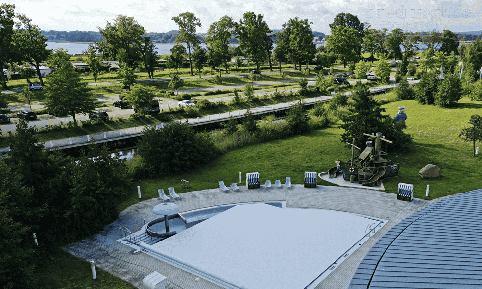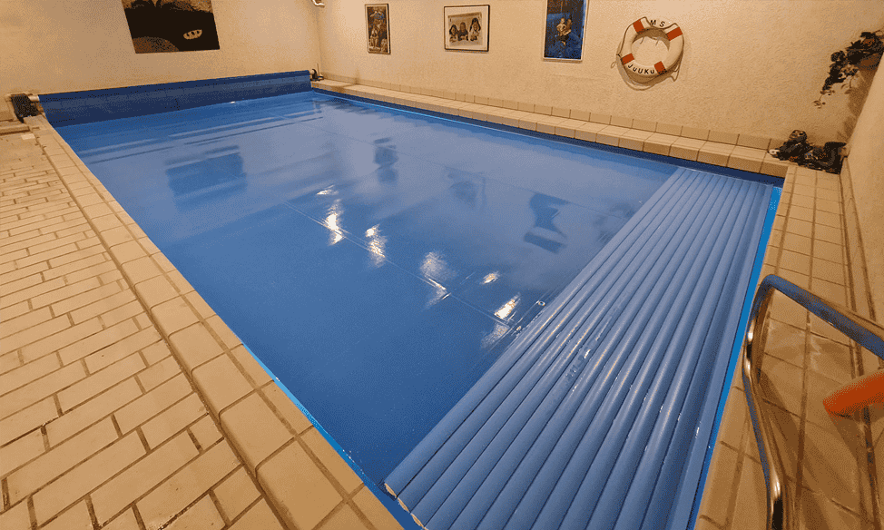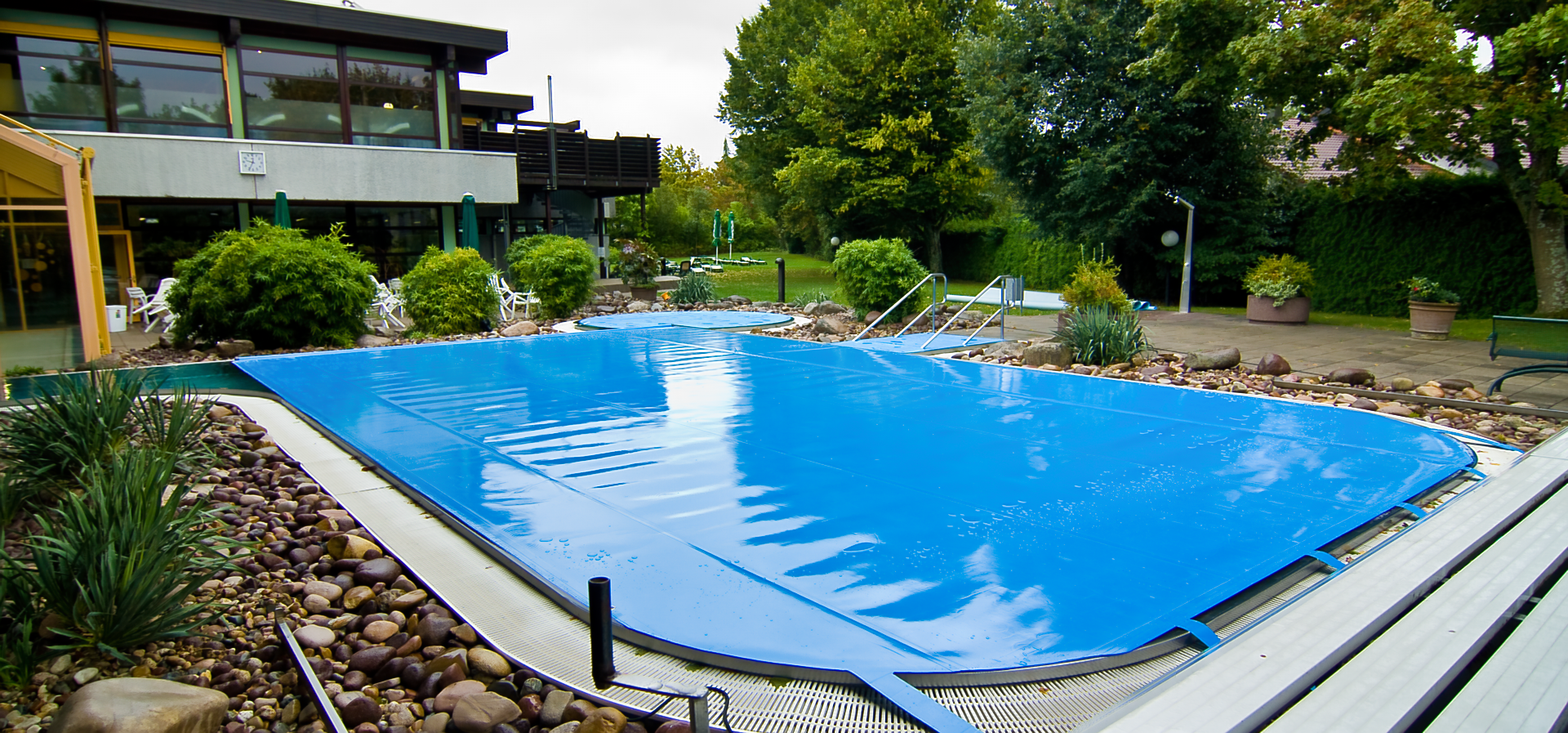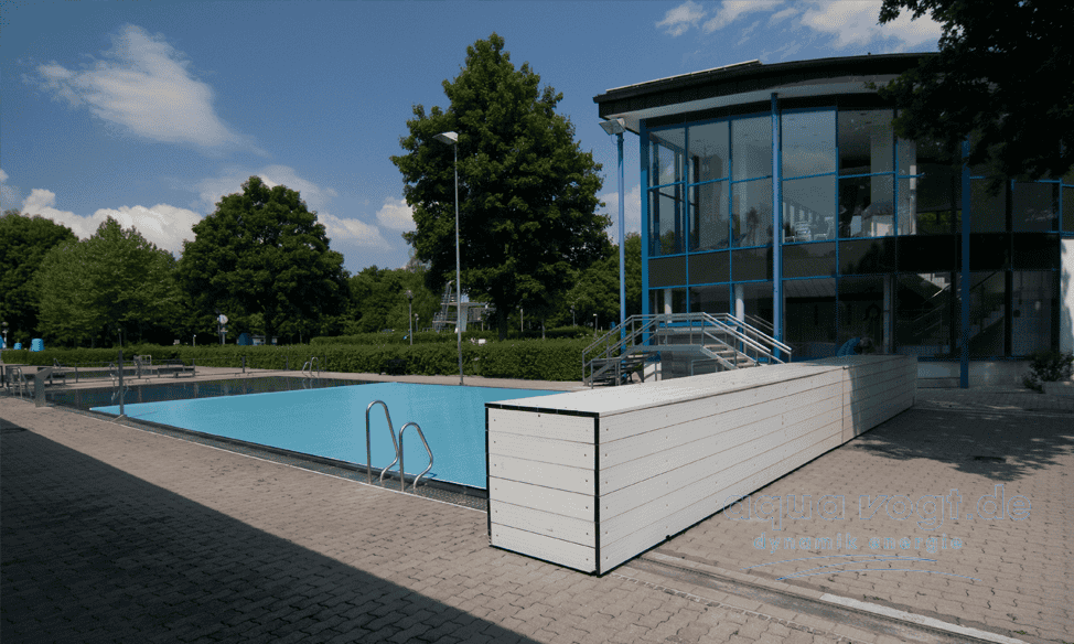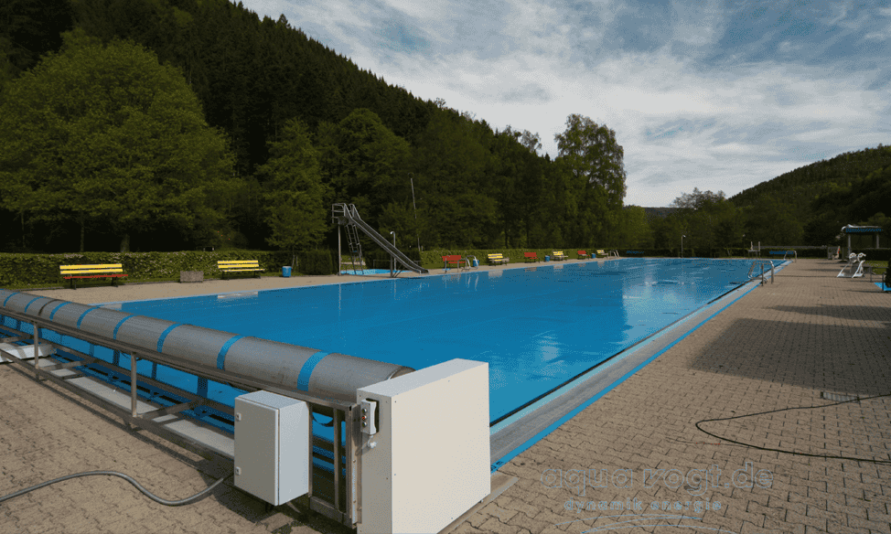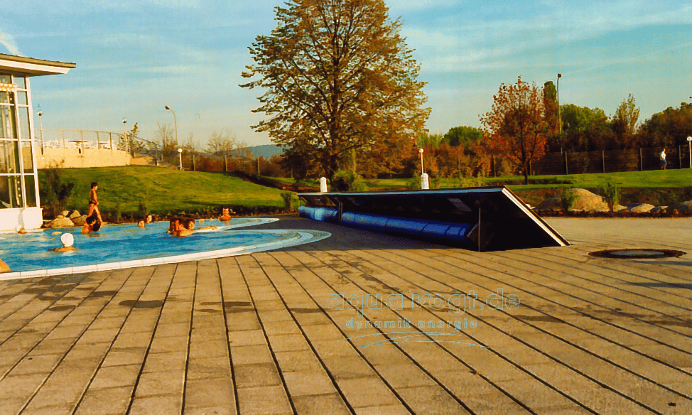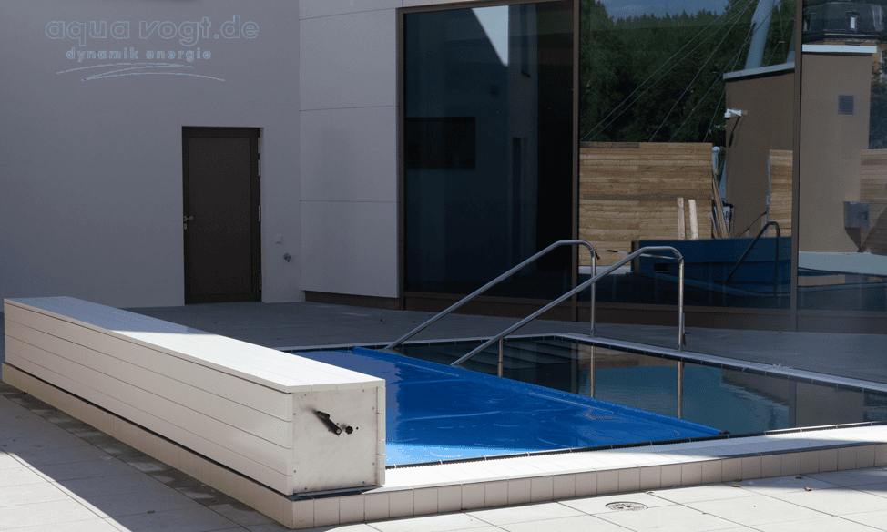 Je nach baulicher Gegebenheit finden sich verschiedene Möglichkeiten die Schwimmbadabdeckung auf - und abzuwickeln, sicher zu verstauen so daß sie während des Badbetriebs nicht stört.